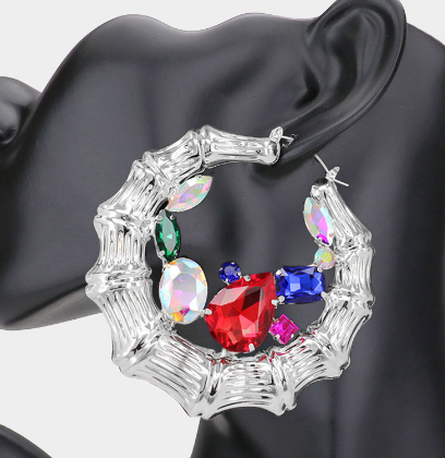 These fun earrings showcase a playful bamboo design decorated with colorful stones. Featuring a shiny silver finish and measuring 3.25" by 3.25", they fasten securely with a pin catch for a lively pop of style.