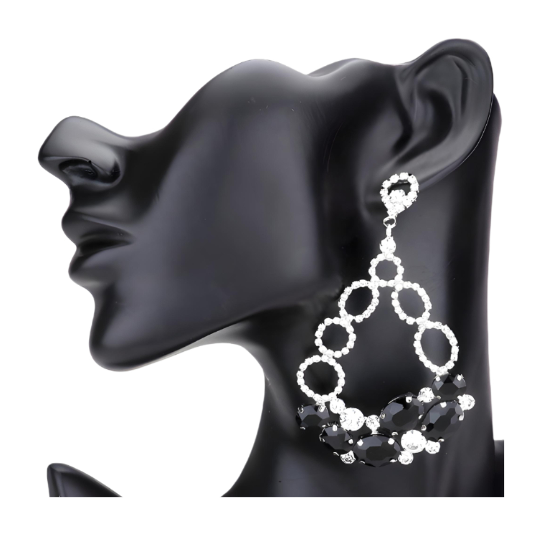 An oval teardrop of black and clear stones, measuring 1.5" by 4.25", lies delicately secured with a post backing.