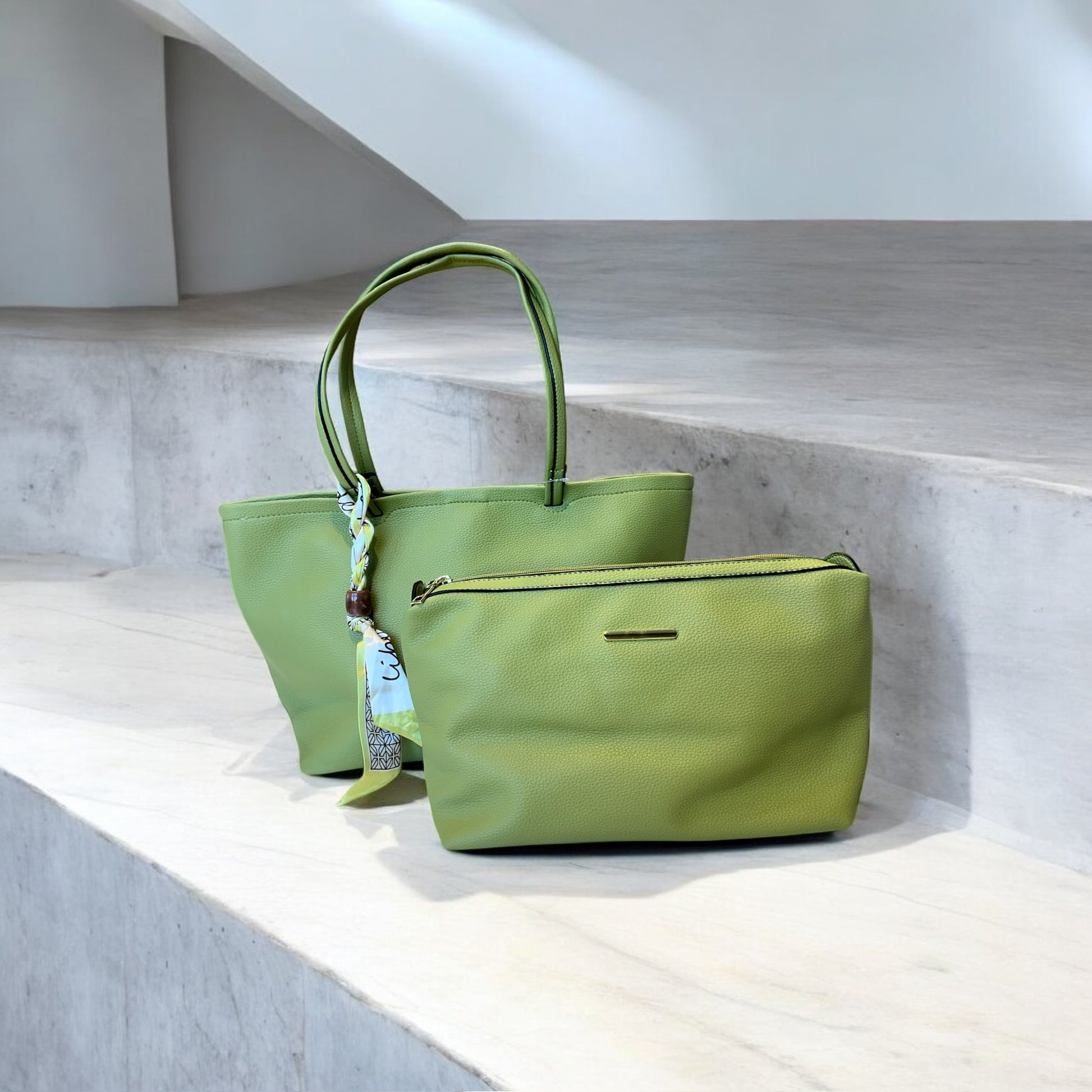 This tote features a detachable internal pouch, making it a versatile 2 in 1 bag. Made from high-quality vegan leather, in a vibrant green color, this tote is both stylish and functional. The large tote measures 20" x 13" and the internal pouch is 17" x 10". Also available in pink and brown.